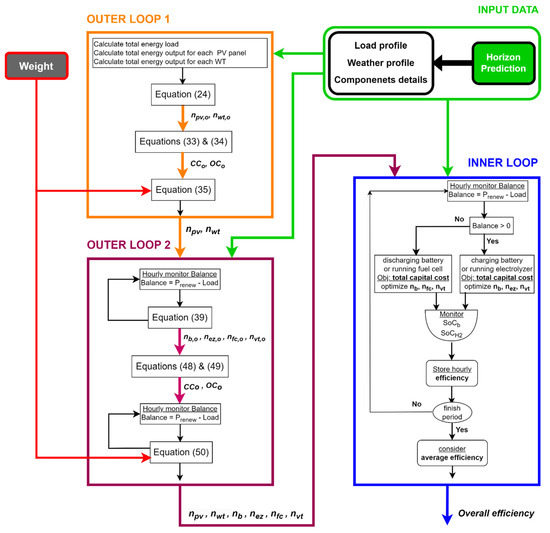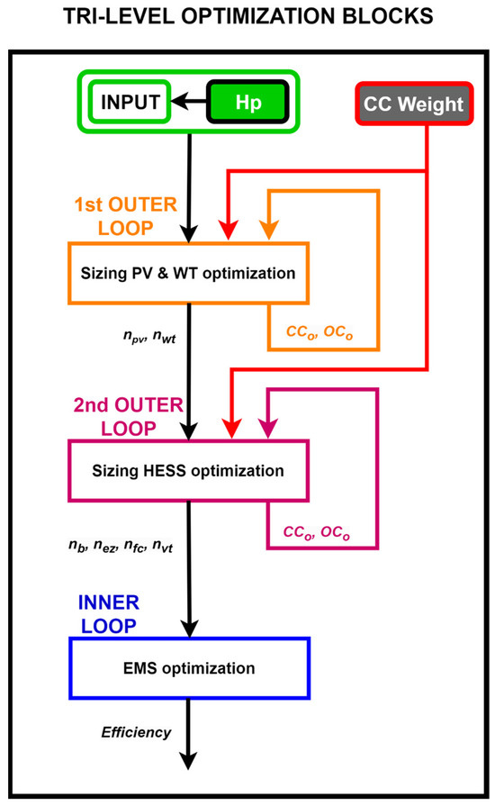 Each component’s efficiency is listed separately in Table A7 of Appendix A. The whole flow chart for the three-level optimization problem is displayed in Figure 3.
