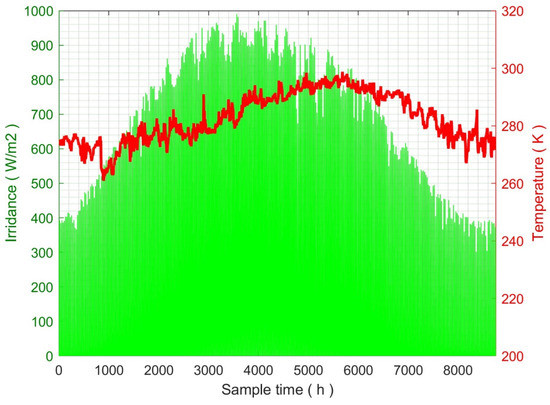Hourly annual irradiance and temperature values.