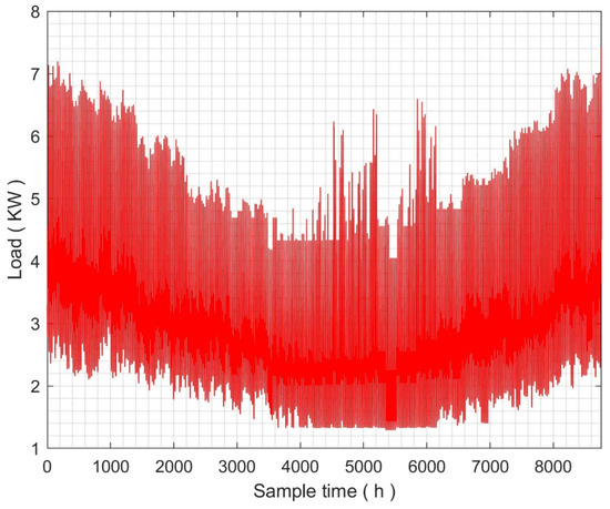 Simulation results are based on annual climate and load profiles. Figure 4, Figure 5 and Figure 6 show the annual irradiance and temperature profiles, wind speed profile, and load profile, respectively. This research study uses weather profiles from Michigan State, USA, for 2021, which were obtained from a public online source [38]. The obtained data are considered as a load profile for a classical medium volume of a residential building in the same latitude [39]. The annual ambient temperature was measured in Kelvin and the solar irradiance in (W/m2). The 8760 h’ wind velocity values in (m/s) were measured at 10 m above the earth. Additional information about the system specifications and components can be found in the appendix [40].