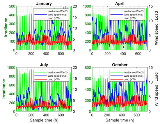 - In the last case, the suggested technique is tested in the month of October, representing the autumn season, which has moderate demand and wind speed with also moderate irradiance and temperature. Table 2 and Figure 7 summarize all conditions for the four scenarios.