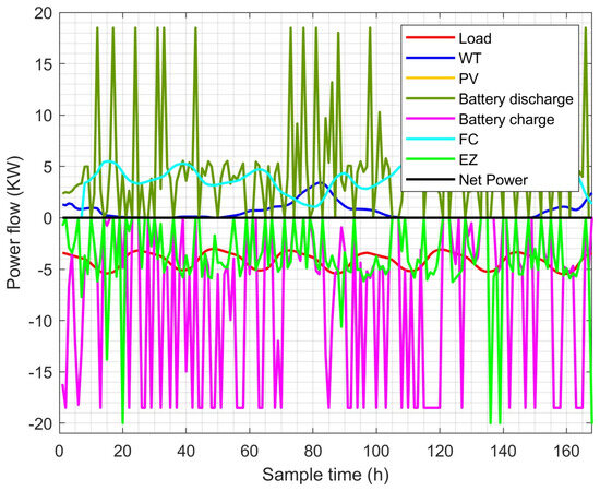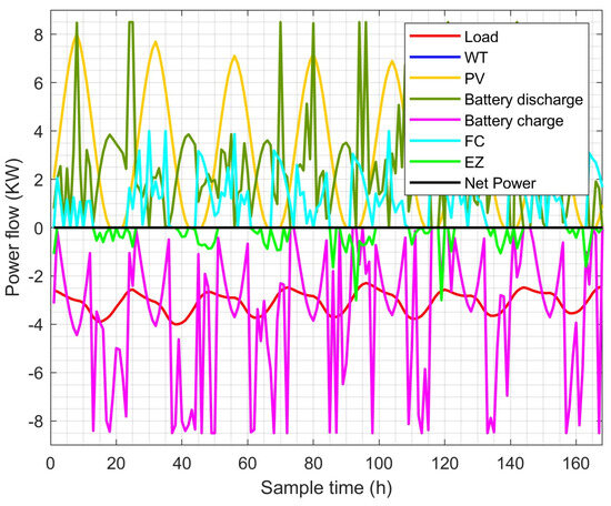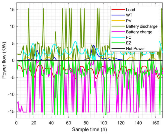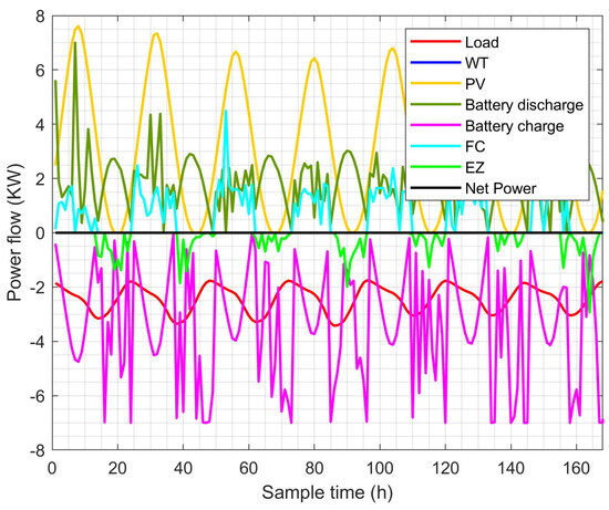 The optimizer determines whether electricity must be transferred from renewable sources to the HESS or from the HESS to the load based on the difference between the power of the renewable sources and the demand. Furthermore, based on the optimization procedure and the batteries’ and hydrogen’s respective states of charge, the optimizer chooses whether to employ the batteries or the hydrogen system.