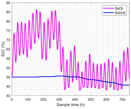 Equation (19) provides the formula for determining the state of charge (SoCH2) of the hydrogen tank [37].