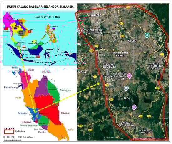 Hunter et al. [41] stated that urban areas are one of the contributors to CO2 emissions due to the high population densities, which are leading to an increase in the number of motor vehicles being used. Usually, this area often experiences traffic congestion, especially during peak hours. When vehicles are stuck in traffic or moving slowly, they burn more fuel, which increases CO2 emissions [42]. In addition, urban areas have extensive road networks to support motor vehicle movement. While this improves mobility, it also leads to an increased number of vehicles on the road, and subsequently to an increase in CO2 emissions [43]. Therefore, this study chose Mukim Kajang as the study area because it has the characteristics that have been stated. There are 342,657 residents in Mukim Kajang, consisting of 60.4% Malays, 19.3% Chinese, 9.7% Indians, and 10.6% from other ethnic groups [44]. The area of this study is 165 km2 and consists of several major cities such as Bandar Bangi, Bandar Baru Bangi, Bandar Serdang, Bandar Kajang, Bandar Baru Kajang, Bandar Teknologi Kajang, Bandar Seri Putra, and Bandar Bukit Mahkota, which have various types of land use such as industrial sectors, residential areas, green areas, agriculture, commercial areas and access roads including the North–South Expressway (PLUS), Kajang–Seremban Expressway (LEKAS), and Kajang Traffic Dispersal Expressway (SILK). However, the scope of this study does not cover all the roads but only focuses on the nearest road in this study area as shown in Figure 1.