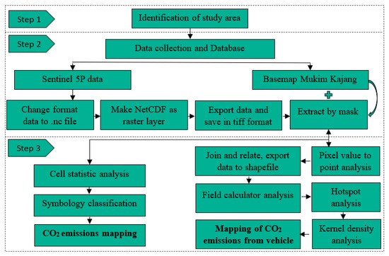 Figure 2 illustrates a Geographic Information System (GIS)-based technical framework, coupled with three essential procedures designed for the comprehensive analysis and mapping of CO2 emissions. This framework was pivotal in understanding and visualizing the spatial distribution of CO2 emissions, particularly from vehicles, within a designated study area. The framework was structured into three primary steps, each of which is crucial for ensuring accurate and effective analysis. The first step involved the identification of the study area. This step was critical as it set the stage for the entire analysis by defining the specific geographical boundaries and the scope of the study. The selection of the study area was based on the objective of the analysis, such as assessing CO2 emissions in urban areas or along major transportation corridors. This involved careful consideration of the area’s relevance to the research objectives, the availability of data, and the need for detailed analysis. By establishing clear boundaries, the study ensured that all subsequent data collection and analysis were both targeted and relevant to the specific area of interest.
