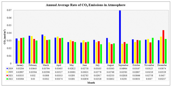 Figure 3 represents the monthly average concentration of CO2 emissions in the air, referred to as the “Tropospheric CO2 Total Column”, for the years 2019 through 2022. These data provide a detailed view of how CO2 levels fluctuate throughout each year, highlighting both the lowest and highest emission months. In 2019, the data reveal a significant variation in CO2 emissions from month to month. The month with the lowest CO2 emissions was June, with an average concentration of 0.0276 mol/m2. This was followed closely by May, which recorded 0.0282 mol/m2. As the year progressed, December registered slightly higher emissions at 0.0307 mol/m2, followed by July at 0.0310 mol/m2. The months of November and October saw even higher levels, with emissions of 0.0313 mol/m2 and 0.0317 mol/m2, respectively, indicating a gradual increase towards the end of the year. On the other hand, September was marked by the highest CO2 emissions for 2019, with a substantial spike to 0.0696 mol/m2. This was a significant outlier compared to other months, due to severe haze from forest fires in Sumatra and Kalimantan, Indonesia [60]. The second highest emissions were recorded in March, at 0.0379 mol/m2, followed by February at 0.0364 mol/m2. April had a slightly lower emission level of 0.0341 mol/m2, while August and January recorded 0.0336 mol/m2 and 0.0328 mol/m2, respectively. The graph clearly indicates that September was the peak month for CO2 emissions in 2019, while June had the lowest levels.