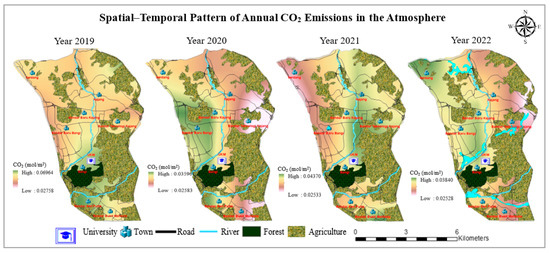 Spatial–temporal pattern of annual CO2 emissions from 2019 to 2022.