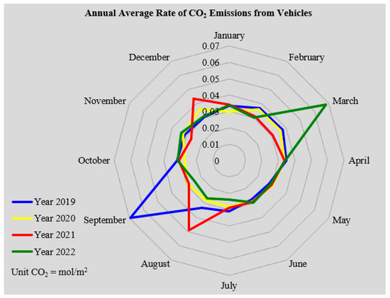 The radar chart in Figure 5 illustrates the annual average rate of CO2 emissions from vehicles over four years starting from 2019 until 2022, with the unit of measurement in mol/m2. A general observation from the chart is the fluctuating pattern of CO2 emissions throughout the months for each year, with notable peaks indicating periods of higher emissions. In 2019, represented by the blue line, there was a significant peak in September, reaching the highest emission rate among all years at approximately 0.06960 mol/m2. The emissions for that year were generally moderate throughout, with noticeable increases towards the latter part of the year. For 2020, shown by the yellow line, emissions were relatively lower compared with 2019, with a notable peak in March at 0.03629 mol/m2. There was a significant drop in emission rates from April to August, which could be attributed to factors like reduced transportation activities. The red line for 2021 shows a moderate peak in December, with emissions just above 0.04915 mol/m2, and maintains a relatively consistent pattern with less pronounced peaks compared with 2019. In 2022, represented by the green line, there was a prominent peak in March similar to the peak observed in 2020, reaching about 0.06803 mol/m2. Emissions for the rest of the year were relatively lower compared with 2019 but slightly higher than in 2020 and 2021. The chart also reveals some seasonal trends, such as higher emissions in September (2019) and March (2022), indicating that certain months were more prone to elevated CO2 emissions, possibly due to increased travel or specific weather conditions that impacted vehicle emissions.