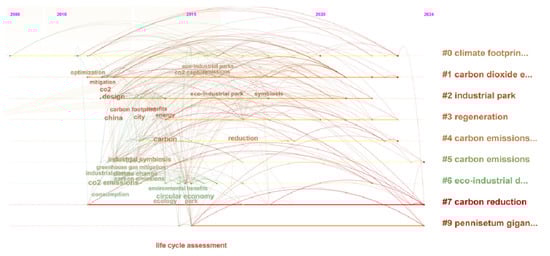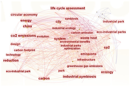 From the keywords of an article, we can clearly understand the research topic and direction of the article. In addition, based on high-frequency keywords, we can also know the current research hotspots and important issues in a certain field. In this study, the selected 148 articles were analyzed to create a keyword co-occurrence network based on CiteSpace, and the results are shown in Figure 2. The top 20 high-frequency keywords in the keyword co-occurrence network are illustrated in Table S1. The top five keyword frequencies related to carbon emission reduction in IPs were China, industrial symbiosis, design, energy, and life cycle assessment. These high-frequency keywords showed that many studies related to carbon emission reduction in IPs were conducted using case studies of IPs in China. In addition, this was primarily accomplished using measures of industrial symbiosis to achieve the carbon emission reduction targets of IPs.