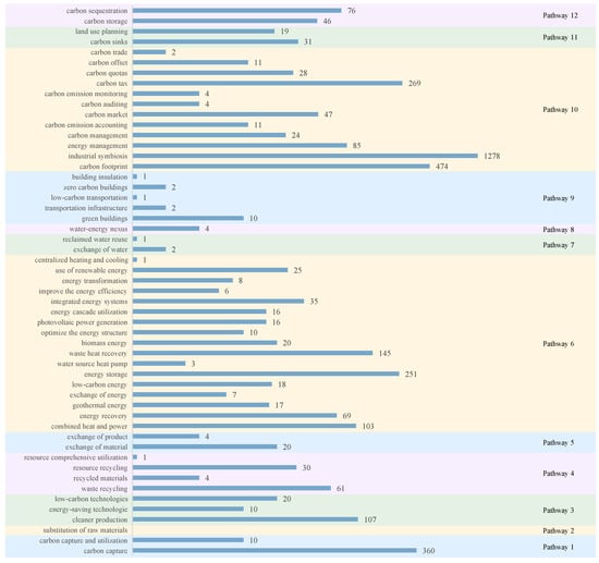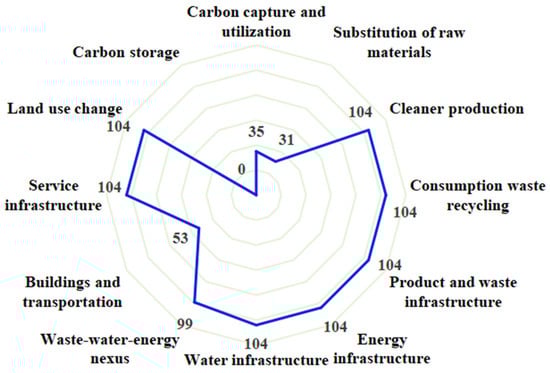 Both Section 3.1 and Section 3.2 are based on an analysis of the published literature, and although they are empirical to some extent, they still cannot represent the actual carbon emission reduction pathways of IPs. Therefore, in this study, we investigated 104 IPs in China (Figure S1), and the results are shown in Figure 6. Except for “Carbon storage”, the other 11 carbon neutrality pathways had different degrees of application in practical industrial activities. In addition, the seven pathways of “Cleaner production”, “Consumption waste recycling”, “Product and waste infrastructure”, “Energy infrastructure”, “Water infrastructure”, “Service infrastructure”, and “Land use change” were discovered in all of the 104 IPs.