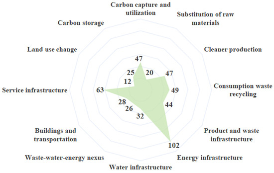 In this study, we analyzed the selected 148 articles by establishing special questions based on 12 carbon neutrality pathways for IPs using ChatGPT, and the results are shown in Figure 5. All of the 12 carbon neutrality pathways were involved in the selected 148 articles. The two pathways mentioned most often were “Energy infrastructure” and “Service infrastructure”, which were mentioned by 102 and 63 articles, respectively. These results were consistent with an analysis of the search term frequencies presented in Section 3.1.2. The less frequently mentioned pathways were “Land use change” and “Substitution of raw materials”. In Section 3.1.2, “Substitution of raw materials” was not extracted from the selected 148 articles, while in the text analysis based on ChatGPT, a total of 20 articles mentioned “Substitution of raw materials”, and this compensated for the deficiency found in Section 3.1.2.