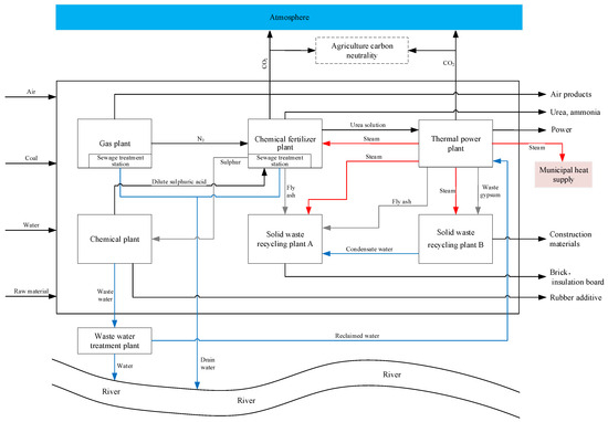 HXIP is located in the northeast of Henan Province, China (Figure S2). Although the HXIP is small, its infrastructure is very well-developed, and its industrial development is quite distinctive. There are six leading enterprises in the HXIP, including a thermal power plant, three chemical new material enterprises, and two solid waste utilization enterprises. A good material and energy exchange network has been formed in the HXIP (Figure 7), which has successively been recognized as a circular industrial park and green industrial park at the provincial level and as the first batch of pollution and carbon reduction synergy pilot industrial park at the national level.