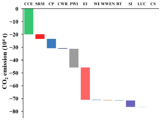 The emission reduction potential of carbon neutrality pathways. Note: CCU—carbon capture and utilization, SRM—substitution of raw materials, CP—cleaner production, CWR—consumption waste recycling, PWI—product and waste infrastructure, EI—energy infrastructure, WI—water infrastructure, WWEN—waste–water–energy nexus, BT—building and transportation, SI—service infrastructure, LUC—land use change, CS—carbon storage.