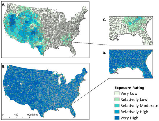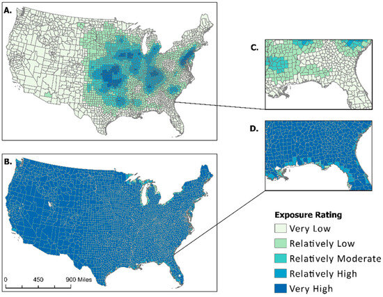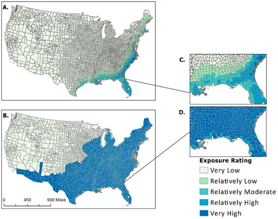 Drought percent area exposed values obtained from the NRI designate all inland counties as 100% exposed, and coastal counties have varying but high exposure percentages. The NRI uses a widespread occurrence methodology to determine drought exposure for the U.S. Although it may be true that every county experiences drought conditions to some extent, the widespread determination of exposure does not allow for more precise examinations. A visual comparison between the NRI percent area exposed and the NCV for drought is shown in Figure 3. The maps in Figure 3 depict the difference in percent area exposed between the NCV calculation (Figure 3A,C) and values derived from the NRI (Figure 3B,D), demonstrating the effect of the NRI’s use of possible determinacy. After taking the proportion of area exposure calculated from the “Exposure—Impacted Area” (sq. mi) provided within the NRI, it is clearly shown that the NRI has deemed all inland states to have very high exposure ratings and varying exposure ratings for coastal counties.