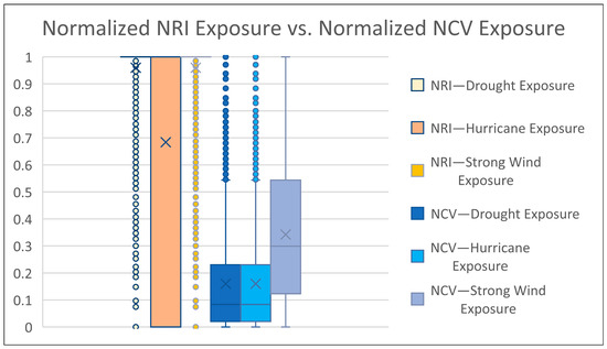 A box-and-whisker plot further illustrates that the NCV transformation yields a more even distribution of exposure values (Figure 5). NRI exposure estimates were obtained by normalizing calculated percent area using the same method as the NCV normalization stated above. This data normalization allows for NRI and NCV comparisons. The first three series from the left in Figure 5 represent the normalized percent area data calculated from the NRI. “NRI—Drought Exposure” and “NRI—Strong Wind Exposure” appear skewed, with their median nearly reaching the maximum value represented. Hurricane exposure estimates from the NRI percent area appear to fall into a single category: fully exposed. However, the lower tail of the box-and-whisker plot for “NRI—Hurricane Exposure” cannot be seen. This is due to the first quartile of hurricane exposure estimates being zero, thus stretching the box (i.e., Quartile 1–Quartile 3) from zero to one. This leaves all those counties receiving zeros for their exposure estimates off the plot. The last three series on the plot represent exposure estimates produced by the NCV methodologies stated above. In these series, NCV hurricanes and droughts appear to have a more even distribution of values, while strong winds represent a higher mean of exposure (Figure 5).