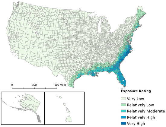 U.S. hurricane event exposure is depicted with a graduated symbology representing an exposure rating between ‘Very Low’ and ‘Very High’ (Figure 6). Southeastern states show the highest level of hurricane exposure, continuing up the eastern coast into northeastern states. Louisiana, Florida, Georgia, South Carolina, and North Carolina have the highest hazard exposure ratings for hurricanes. The extent of exposure wanes as proximity to the coast decreases, i.e., as one travels inland. States on the West Coast received ‘Very Low’ ratings for hazard exposure, with two notable exceptions in southern Arizona receiving a ‘Moderately Low’ rating. Multiple counties in southern California and Arizona received higher exposure values before applying the new factoring method. Alaska and Hawaii received a ‘Very Low’ exposure rating.
