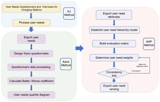 In this study, the KJ method, Kano model, and analytic hierarchy process (AHP) were employed to categorize user needs and assess their importance. The research primarily focused on analyzing user needs and their corresponding weightings. The methodology was divided into three main phases. In the first phase, a series of user needs were collected through questionnaires and interviews with users, and these needs were summarized using the KJ method to systematically organize the data. In the second phase, the Kano model was applied to categorize the identified needs into four dimensions: must-be, one-dimensional, attractive, and indifferent attributes. In the third phase, the AHP method was used to calculate the weight of each need, and through a process of evaluation and ranking, the most critical user needs for EV charging stations were determined. To provide readers with a clear overview of the research process, the methodology flowchart is presented in