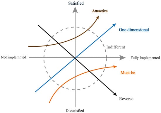 33]. It is a tool for categorizing and prioritizing user needs, used to evaluate how these needs impact user satisfaction. The model captures the nonlinear relationship between product performance and user satisfaction [