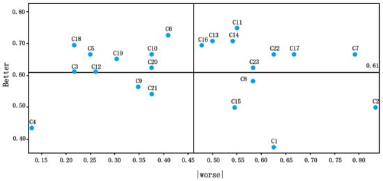 37]. The scatter plot is divided into four quadrants based on the better–worse coefficients, as shown in