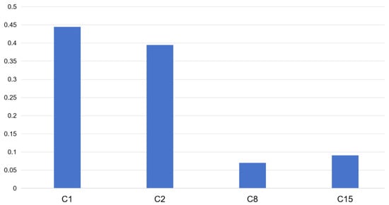 Figure 9, C1, charging gun stability (0.3176), holds the highest weight among all indicators, indicating that the stability of the charging gun is clearly the primary consideration for users when selecting a charging station. The stability of the charging gun is directly related to the user’s charging experience as well as the safety and reliability of the equipment. Users are concerned about potential equipment failures or instability during charging, which not only affects charging efficiency but also poses potential safety risks. Therefore, the stability of the charging gun is considered a core element in determining the quality of the charging station and the trust of its users. C2, system stability (0.2822), ranks second, showing that users place great importance on the continuous operation capability of the charging station system. The stability of the system affects not only the availability of the charging station but also directly determines users’ confidence in the reliability of the charging service. Users expect the system to run stably for extended periods of time, avoiding frequent failures or interruptions, which is critical to improving the overall service level of the charging station. C7, safety performance (0.0885), ranks third, indicating that users are particularly concerned about the safety of the equipment when using the charging station, especially during high-current operations. High-quality safety performance not only protects users and vehicles from damage but also minimizes the risk of follow-up issues caused by accidents. C15, payment convenience (0.0648), ranks fourth, demonstrating that users place considerable emphasis on the payment experience during the charging process. Users not only expect the charging station to support multiple payment methods but also want the payment process to be simple and efficient, avoiding complicated steps, reducing unnecessary waiting times, and enhancing the smoothness of the charging process. Therefore, offering diverse and convenient payment options at charging stations is crucial for optimizing the user experience and improving user satisfaction. C8, real-time feedback on charging station status (0.0501), ranks fifth, reflecting users’ demand for information transparency. Real-time feedback allows users to better understand the current status of the charging station, such as availability or charging progress. The timeliness of this information helps users plan their charging sessions more efficiently, while also avoiding long queues or the inconvenience of encountering an out-of-order charging station.