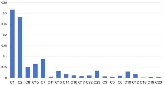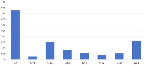 Figure 7, C7 safety performance (0.4285) ranks first, followed by C23 emergency services (0.1630) and C13 compatibility (0.1525). C14 charging station location guidance (0.0835), C11 occupancy reminders (0.0567), C22 information transparency (0.0534), C17 user habit tracking (0.0364), and C16 help and support (0.0260) rank lower. The highest weight of C7 safety performance indicates that users have a strong expectation for the safety of charging stations, especially concerning electrical operations. Given the potential safety risks during charging, users expect the equipment to be equipped with additional safety measures to ensure the safety of the charging process. C23 emergency services, ranking second, shows that users require timely assistance in emergencies, especially when charging stations are highly utilized or malfunctioning. This need ensures that users feel more secure when facing unforeseen situations. C13 compatibility, ranking third, suggests that users expect charging stations to be compatible with different brands and models of electric vehicles, minimizing the challenges caused by incompatible connectors or charging protocols. This reflects the users’ emphasis on the diversity and adaptability of charging station equipment, aiming for seamless interoperability between various vehicles to improve convenience. In contrast, C17 user habit tracking and C16 help and support have lower weights. While C17 user habit tracking can provide personalized experiences, users consider it a lower priority compared to safety and emergency services, viewing it as non-essential during the charging process. C16 help and support, with the lowest weight, indicates that although after-sales support and service are important for enhancing user satisfaction, timely technical support is not seen as an urgent need in users’ eyes.