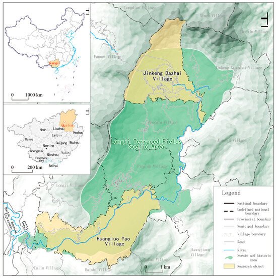 Situated in Longsheng County, Guilin City, Guangxi Zhuang Autonomous Region, Jinkeng Dazhai Village and Huangluo Yao Village exemplify typical ethnic communities that not only showcase rich cultural heritage but also function as popular tourist destinations with residential community characteristics. The majority of tourism operators within these villages are local residents, creating a distinctive environment for social network research and enhancing the understanding of social networks and their influence on tourism support behavior. Consequently, selecting these two locations as case studies offers significant representativeness. The study area is shown in Figure 2.