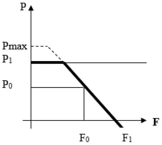 Figure 2 shows the frequency F and mechanical power Pm of the system of axes and the equilibrium relationship imposed by the speed regulator. A “limiter” is a servo-control superimposed on the regulator, prohibiting the machine from exceeding a given power, where its limits are adjustable. Therefore, the real characteristics are drawn in bold in Figure 2.