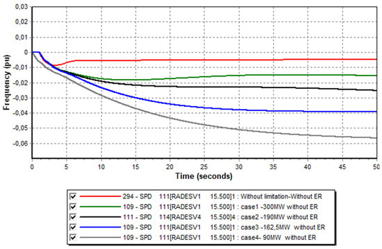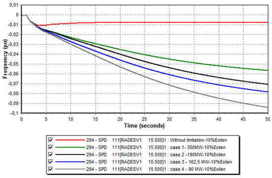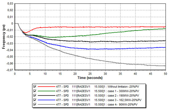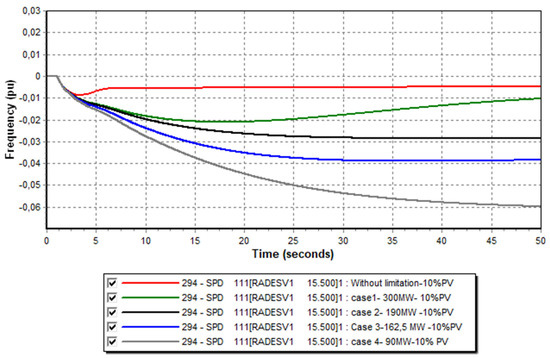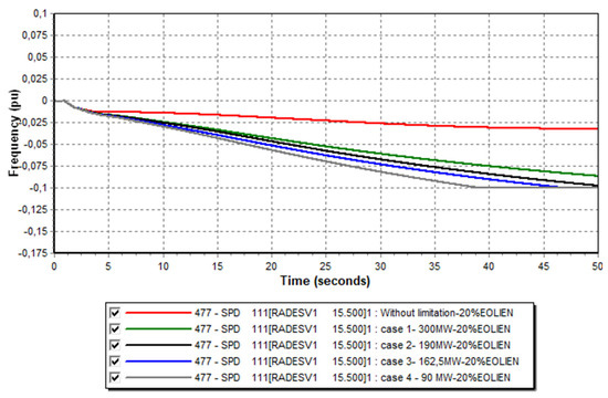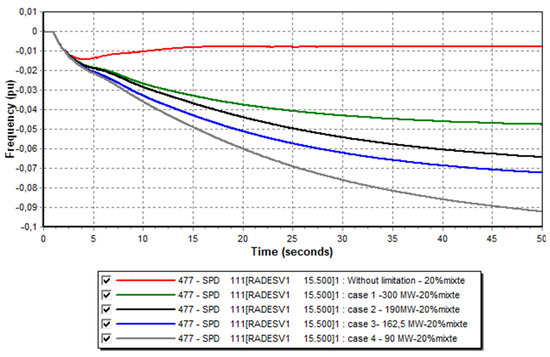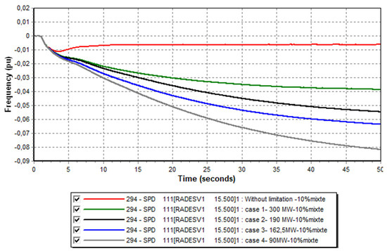 In this study, we began examining a basic scenario involving only conventional production groups through a theoretical case with an “Infinite Reserve” to determine the minimum frequency following a production loss from the largest unit (loss of the 380 MW of combined cycle group, representing 13% of total production). Subsequently, we moved on to limiting the rate of frequency change, which required restricting the maximum power injected by a generator (by limiting the ΔP). Next, we integrated different rates of various renewable energy sources, always considering the loss of the large electricity production group. We began setting a specific volume of the primary reserve for a given unit and calculated the corresponding value of the active power limiter for its speed governor to input into the Pmax parameter of its dynamic model. This allows us to observe the behavior of electrical frequency with different reserve rates.
