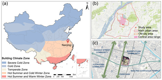 Nanjing (31°14″–32°36″ N, 118°22″–119°14″ E), the capital city of Jiangsu Province, China, has a subtropical monsoon climate. According to the climatic zoning of Chinese architectural design, Nanjing belongs to the hot-summer and cold-winter zones (Figure 1a), which is one of the most challenging regions to provide buildings with occupant comfort. Nanjing has abundant rainfall, four distinct seasons, a significant urban heat island effect, and continuous heat waves in summer, and is known as the ‘city of furnaces’ [33,34].