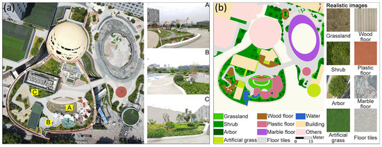 The study area was located on the rooftop of Pengxin AQUA City in Qinhuai District, Nanjing, Jiangsu Province, within a high-density mixed neighborhood in the old city center area of Nanjing (Figure 1b), with an average building density of approximately 30–35%. The building is a six-story brick composite structure with a total roof area of approximately 7000 m2. It was completed in 2008, making it the largest public recreational GR in Nanjing and a scarce GI in the surrounding high-density environment (Figure 1c). Figure 2a presents an orthophoto map of the study area. During noon, the study area was exposed to the sun, without any other building shading. Roof surfaces can be categorized as GRs with arbors, shrubs, grasslands, or bare roof paving (BR). Arbors were primarily evergreen trees with a height of 2–4 m. Shrubs mainly comprised Ligustrum lucidum Ait., Loropetalum chinense var. rubrum, and Buxus sinica in the form of free-standing globes and patches with a height of 0.5–1.2 m. Grasslands primarily comprise Zoysia matrella lawns, with a planting area of approximately 2600 m2. These surfaces were the focal experimental areas, as presented in Figure 2b.