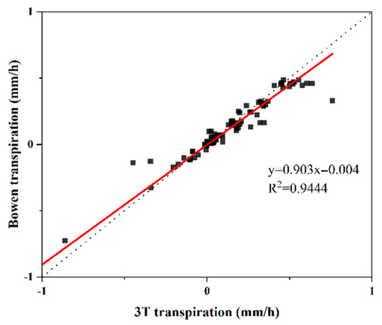 The validation revealed a high degree of agreement between the vegetation ET estimates produced by the Bowen ratio energy balance approach and the results of ET assessed by the 3T model based on thermal infrared remote sensing from UAVs. With a correlation coefficient of 0.972, the ET rates determined using the two approaches were both statistically significant at the 0.01 level. Additionally, the validation results of the linear regression are presented in Figure 3, where the data distribution is close to a 1:1 line, indicating that the rate determined by the 3T model is similar to that determined by the BREB method. This further establishes the greater feasibility and efficiency of the 3T model in estimating the ET rate of urban vegetation.