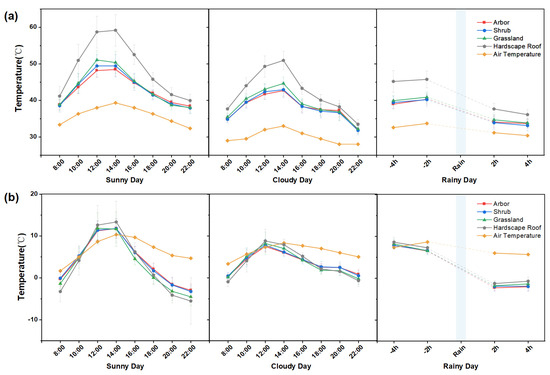 The daily trends in roof surface and air temperatures are presented in Figure 4. Figure 4a,b show the results for summer and winter, respectively. Daily variations in air temperature and vegetation surface temperature presented an increasing and then a decreasing trend during the observation period. In summer, the surface temperature of the hardscape roof was consistently higher than the surface temperature of the vegetation and the air temperature, whereas in winter, it appeared that the air temperature was higher than the roof surface temperature. In addition, the surface temperatures of different vegetation types had significant differences in summer and winter (p < 0.05). In general, the herbaceous surface temperatures were consistently higher than those of the other two vegetation types in summer from 8:00 to 16:00 and for 4 h before and after the rain, presenting a trend of rapid warming and cooling, whereas the peaks of the surface temperatures of the vegetation types in winter were closer, with the overall temperatures of the arbors and shrubs converging, and the herbaceous temperatures varied the most drastically.