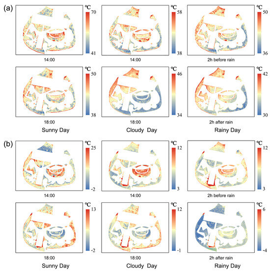 Spatial distribution of surface temperature of vegetation at typical moments under three weather conditions: (a) summer, (b) winter.