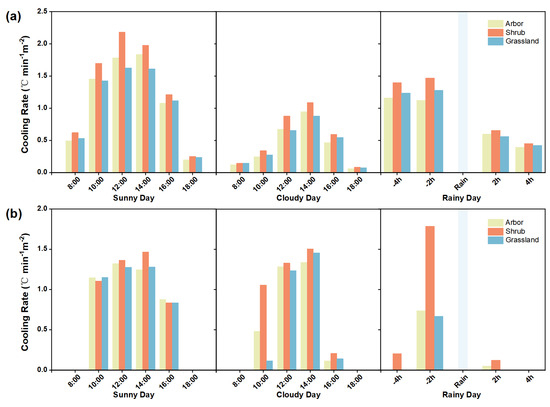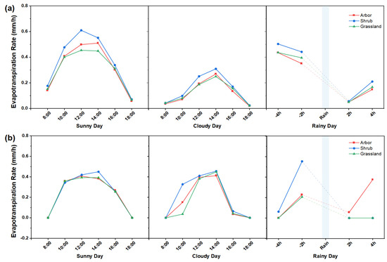 As presented in Figure 6a, the ET rate of three kinds of vegetation increased rapidly from 8:00 to 12:00 on summer sunny days and reached a peak at 12:00, the ET rate of arbors, shrubs, and grasslands was 0.50 mm/h, 0.61 mm/h, and 0.45 mm/h, respectively. The ET rate of the three kinds of vegetation reached a peak at 14:00 on cloudy days and decreased significantly compared with that on sunny days. The peak time was close to that of the vegetation surface temperature. After the peak, the ET gradually decreased, when high temperatures caused vegetation stomata to close and the ET to decrease by inducing water stress [46]. The vegetation ET rates showed a decreasing trend in the 4h before the rainfall, and after the rainfall, the ET rates increased but remained lower than the pre-rainfall level.