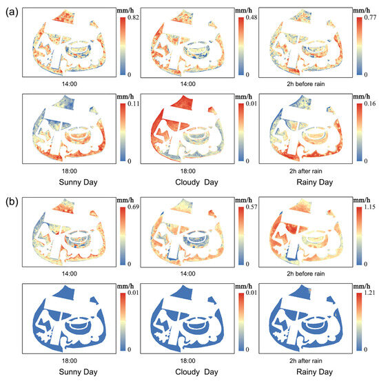 Spatial distribution of ET rate of vegetation at typical moments under three weather conditions: (a) summer, (b) winter.