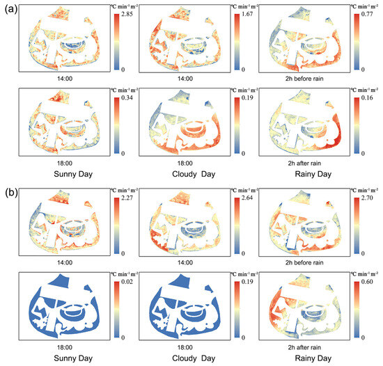 The spatial distribution of the evaporative cooling rates of green roof vegetation at typical times during different summer weather conditions is presented in Figure 9a. The lowest evaporative cooling rate was observed in the central lawn at 14:00 on a sunny day, which may be related to its very high surface temperature and low ET rate at this time. The evaporative cooling rates of the arbors and spherical shrubs showed the same diffusion from the center to the edges. The spatial distribution of the evaporative cooling rate at 18:00 on a cloudy day showed an inverse relationship with the spatial distribution of both the surface temperature and ET rate at the corresponding moment, which is presumed to be more influenced by surface temperature than wind. The evaporative cooling rates of the GRs before and after the rainfall were high in the southeast and low in the northwest. Rainfall significantly reduced the magnitude of the cooling values and the range of distribution of the high cooling effect.