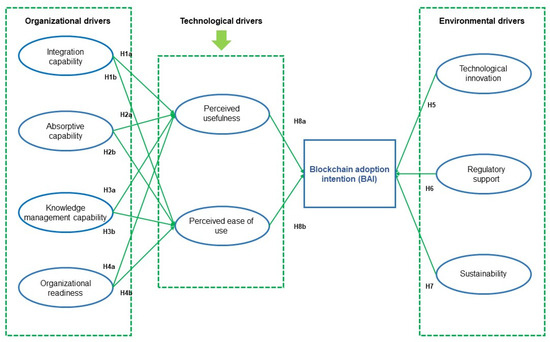 According to Kamble, Gunasekaran, Subramanian, Ghadge, Belhadi, and Venkatesh [9], integration capability refers to an organization’s ability to connect its IT systems with the business operations of both internal and external partners, such as suppliers, customers, government agencies, and competitors, to ensure reliable access to information. From this perspective, an organization’s integration capability can be assessed by the extent to which its IT systems share data related to orders, production, customers, and markets, the depth of integration with innovative technologies, and interoperability with other systems [23]. Therefore, for those organizations operating in the automotive supply chain and planning to transit their current operation model to a CE approach, integration capability is considered to be a core element for the adoption of blockchain technology [22]. Accordingly, the greater an organization’s ability to integrate new technologies, e.g., the blockchain, with existing systems or platforms, the higher the ease of use of and usefulness of the technologies that may be perceived by employees [22,42]. In light of the insights gained, the subsequent hypotheses are outlined: