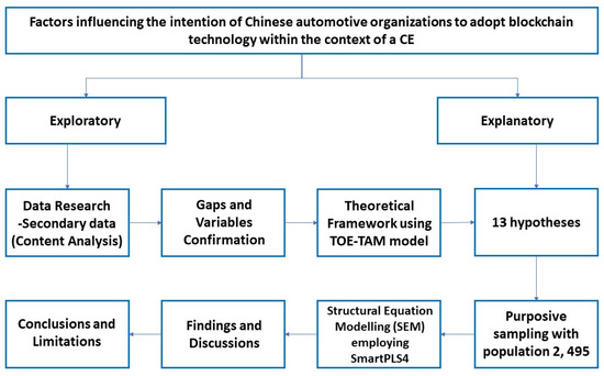 This study primarily employs exploratory and explanatory research methods to investigate the factors influencing the intention of Chinese automotive organizations to adopt blockchain technology within the context of a CE. Specifically, the exploratory method is used to identify and confirm research variables, followed by an in-depth analysis of the selected variables through explanatory methods using quantitative data to test the hypotheses proposed in the TOE-TAM framework. To achieve this, the research team designed a preliminary questionnaire, which was reviewed by two academic experts and two automotive supply chain experts, all of whom have extensive experience in digital technology innovation and implementation. Subsequently, a rigorous pilot test was conducted with the assistance of IT experts from pre-selected Chinese automotive companies to ensure that potential respondents could accurately understand the questions and provide meaningful feedback. As a result, the final questionnaire comprised 36 items (see Appendix A) covering all essential constructs and employed a 5-point Likert scale for data collection, where “1” indicated “strongly disagree” and “5” indicated “strongly agree”. The questionnaire is provided in https://www.wjx.cn/vm/etUtOBG.aspx# (accessed on 2 November 2024). Finally, the quantitative data collected from the survey results were systematically analyzed using the statistical analysis software SPSS 27 and SmartPLS v4.0. An overview of the entire research process is depicted in Figure 3.