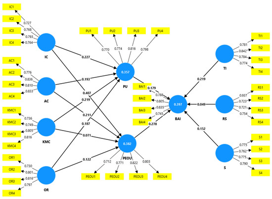 Firstly, the predictive relevance of the exogenous variables was examined through the calculation of the R2 and Q2 values. As presented in Table 5, the R2 value for the blockchain adoption intention is 0.397, while the R2 values for the perceived ease of use and perceived usefulness are 0.382 and 0.357, respectively. According to Cohen [74], R2 values of 0.02, 0.13, and 0.26 correspond to small, medium, and large effects, respectively. Therefore, the R2 values for the blockchain adoption intention, perceived ease of use, and perceived usefulness are considered satisfactory. Additionally, the Stone–Geisser Q2 values were calculated to further verify the predictive relevance of the model. Hair et al. [69] pointed out that Q2 values exceeding 0, 0.25, and 0.50 indicate a small, medium, and large predictive relevance, respectively. The obtained Q2 values (0.348 for the blockchain adoption intention, 0.350 for the perceived ease of use, and 0.330 for the perceived usefulness) demonstrate significant predictive relevance for the structural model. Overall, both the R2 and Q2 values validate the strong explanatory power of the model for these constructs.