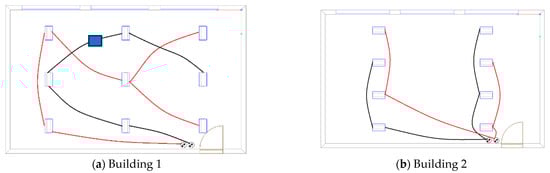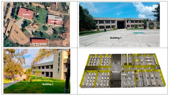The José Mario Molina Pasquel y Henríquez Technological Institute is a higher education institution in Mexico, located in Tamazula de Gordiano, Jalisco, south of Guadalajara. Figure 1 shows an aerial view of the campus, where two main buildings labeled “Building 1” and “Building 2” can be identified, which serve as the reference for this case study. In the upper-right panel of the figure, a frontal photo of “Building 1” is displayed. In this photograph, the facade of the construction with the primary entrance is seen. On the other hand, the lower left photograph indicates a picture of “Building 2”, while the image is a 3D plan of the interior of “Building 1”. This picture representation illustrates the format of the interior areas, together with several classrooms with desks and chairs, laboratories, and hallways, presenting an in-depth view of the construction’s internal corporation. It is worth citing that the architectural format is “technological institutes in Mexico”, of which there are around 254 throughout the country, making the methodology presented here replicable for these institutions. It is important to note that most of the lighting systems at the Technological Institute are used indoors, making exterior lighting consumption insignificant in comparison. For this reason, our focus has been on optimizing interior lighting, where energy savings and efficiency improvements have the greatest impact.
