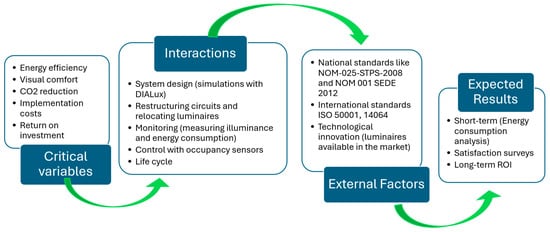 Figure 2 shows the diagram of the conceptual model presented here. The conceptual model describes how the critical variables (energy efficiency, visual comfort, CO2 reduction, and return on investment) interact within the proposed methodology through system design (simulations with DIALux) and monitoring and control (occupancy and natural light sensors) to optimize energy usage and improve visual comfort. These interactions are aligned with external factors such as national and international regulations (NOM-025-STPS-2008 [44], ISO 50001) and technological innovation, allowing the expected outcomes to be achieved, including a 40% reduction in energy consumption in the short term and a return on investment within 2.36 years, ensuring long-term sustainability and efficiency according to the hypothesis proposed.