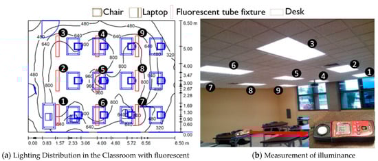 The first step started with the analysis of the current lighting system, which mainly includes 32 W T8 fluorescent tubes with ballasts. Lighting levels were measured in diverse areas of the institute, such as classrooms, hallways, and administrative offices, and DIALux simulation software was used to compare actual light distribution. This evaluation found out that some areas have been over-illuminated, exceeding 766 lux, while others showed a deficit in lighting, failing to meet the recommendations of NOM-025-STPS-2008 and ISO 8995-1:2002. Figure 4 shows the luminous flux distribution and measurements acquired with the lux meter made in a classroom of Building 1. The numbers and isolux lines in Figure 4a represent the illuminance and the representation of the luminous flux distribution at different points in the classroom at desk level; these values are expressed in lux (Lx). This preliminary step is aligned with Section 4.4.3 of the ISO 50001 standard, which emphasizes the electricity performance assessment. The life cycle of an installed T8 fluorescent tube ranges between 15,000 and 20,000 h (approximately 5 to 7 years). During its usage phase, a 32 W T8 lamp will consume between 480 and 640 kWh. Therefore, the estimated CO2 emissions, using an emission factor of 507 gCO2 per kWh (or 0.507 kgCO2/kWh), the associated emissions range from 0.243 to 0.324 tons of CO2 per tube, with the values calculated using the following equation [37]: