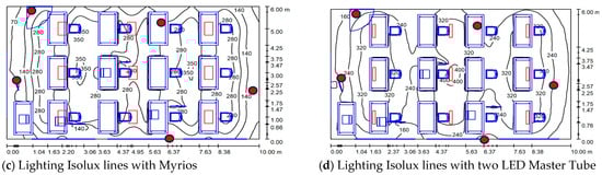 The proposals in Figure 5 require certain modifications to the installation. For example, the Myrios and Curvalum luminaires have a 24” × 24” housing, which means that the current 48” × 24” housings must be removed and replaced with the new ones. In the case of the LED Master lamps, the existing housing was utilized since the tubes are the same length as the fluorescent ones and have the same connection. Additionally, they do not require an external ballast, which simplifies the installation, as they incorporate an integrated driver circuit within the tube itself. This driver performs functions equivalent to those of a ballast, such as regulating current and minimizing issues related to flicker or temporal lighting artifacts: it is sufficient to replace the lamps, remove the fluorescent tubes and the ballast, perform the wiring in the area where the ballast was removed, and install the new tubes. The previous luminaires, with fluorescent tubes, are from the brand Lithonia Lighting and can accommodate up to four tubes, so options for installing two and three tubes in the same space were considered. In our analysis, we selected the configurations of two and three tubes, and the internal arrangement of the tubes was adapted according to the manufacturer’s recommendations to optimize light distribution.
