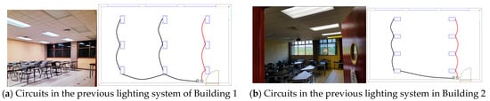 - ISO 50001—Energy Management: The reduction in energy consumption with the aid of changing T8 fluorescent tubes with LED tubes, is consistent with the principles of ISO 50001, which seeks continuous improvement in performance through a planned approach. The reduction can be carried out by optimizing light distribution and the use of occupancy and natural light sensors, as shown in Figure 6, which compares the previous electrical circuit system Figure 6, with the redesigned one, Figure 7. It can be observed that the distribution of luminaries where reallocated in the classroom.