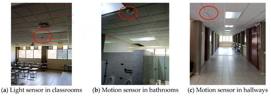 The integration of occupancy and natural light sensors were also installed in different parts of the campus as shown in Figure 8. This allowed for the automatic adjustment of lighting levels based on classroom activity and available natural light, ensuring that energy is only used when necessary.