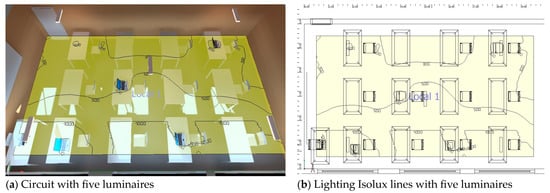 Figure 9. Lighting Isolux lines in a classroom of Building 1.