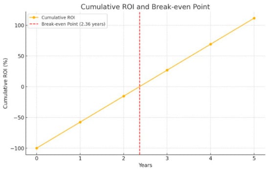 The initial installation cost, based on the replacement of 622 LED Master Tubes, is MXN 186,000.00. This amount includes the cost of the LED tubes, which amounts to MXN 51,004.00, as well as labor costs for installing the tubes in 311 fixtures, totaling MXN 71,530.00, and the necessary rewiring. Additionally, wiring and other accessories had a cost of MXN 28,426.00. For the integration of 48 smart sensors, the acquisition cost was MXN 20,160.00, and their installation cost was MXN 14,880.00. It is important to note that the existing luminaires were not replaced, as the system design allows for the reuse of the original fixtures. The estimated ROI for the first year is approximately −57.71%, as the initial investment is not fully recovered in the first year. However, considering the annual savings of MXN 78,904.32, the break-even point would be reached in 2.36 years (see Figure 10 for the ROI and break-even chart), at which point the savings will surpass the initial cost, generating net benefits.
