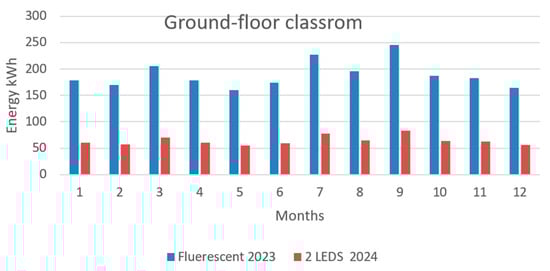 By monitoring with an energy meter from the brand BYTESHOP, model B01MR2DKG6, an analysis of energy usage was conducted one year after its installation, specifically in the ground-floor classrooms. In 2023, the energy consumption with fluorescent tubes was evaluated, and the advantages of implementing two LED tubes is compared, with the goal of projecting the results by the end of 2024.