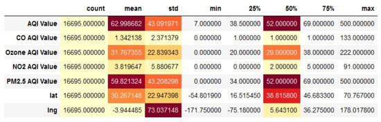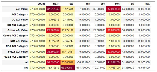 By following these steps, we can leverage air quality data to build effective classification models. These models can be used for real-time air quality monitoring, health advisories, and even predicting future air quality trends, empowering us to make informed decisions about public health and environmental protection. The statistical analysis of the air quality dataset is shown in Figure 3. However, Figure 4, Figure 5 and Figure 6 are subsets of the dataset with AQI categories 0 and 2, respectively. From all of the figures, one can see that the count of each label is the same. Additionally, there are no null values in the dataset, ensuring data integrity for analysis. The features AQI Value, Ozone AQI Value, PM2.5 AQI Value, and latitude exhibit the highest mean and standard deviation among all features, indicating significant variability and suggesting that their distributions are relatively broad. This variability implies that these features have a substantial influence on the dataset’s overall dynamics. However, it is important to note that the above statistical summary provides an overview of the overall air quality across all recorded instances.