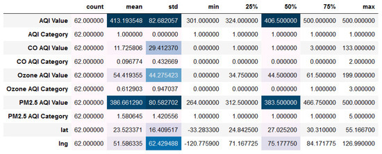 - Available online: https://www.kaggle.com/datasets/adityaramachandran27/world-air-quality-index-by-city-and-coordinates (accessed on 30 May 2024).