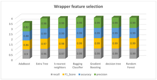 - The proposed Random Forest Classifier model with wrapper feature selection achieves the highest accuracy compared to other techniques, achieving 99.99%. Based on the raw dataset, the F1-score, recall, and precision values of the Random Forest model with wrapper feature selection are 99.96%, 99.97%, and 99.98%, respectively. These experimental results demonstrate the advantage of our proposed approach.